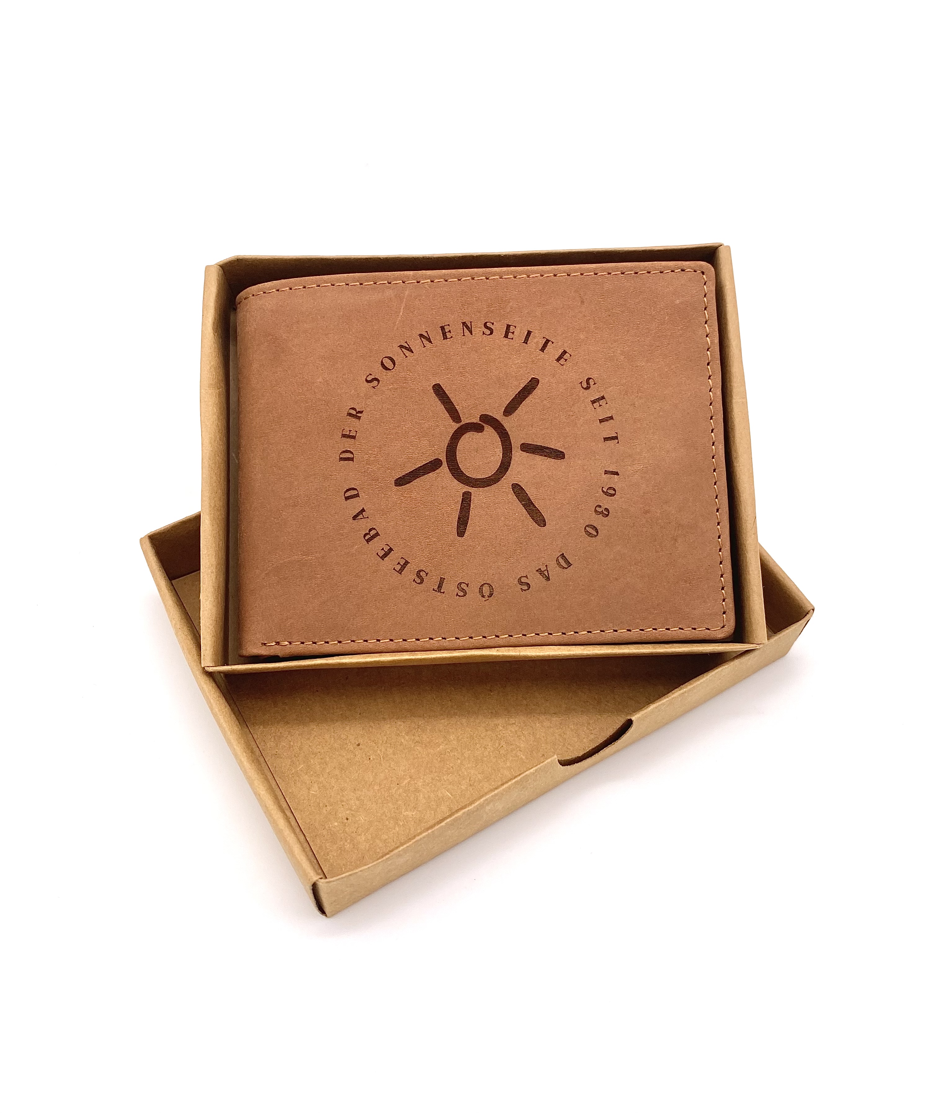 Geldbörse für Grömitz Fans - aus echtem Rindsleder - hellbraun - für Sie und Ihn - mit Gravurmotiv "Sonne"